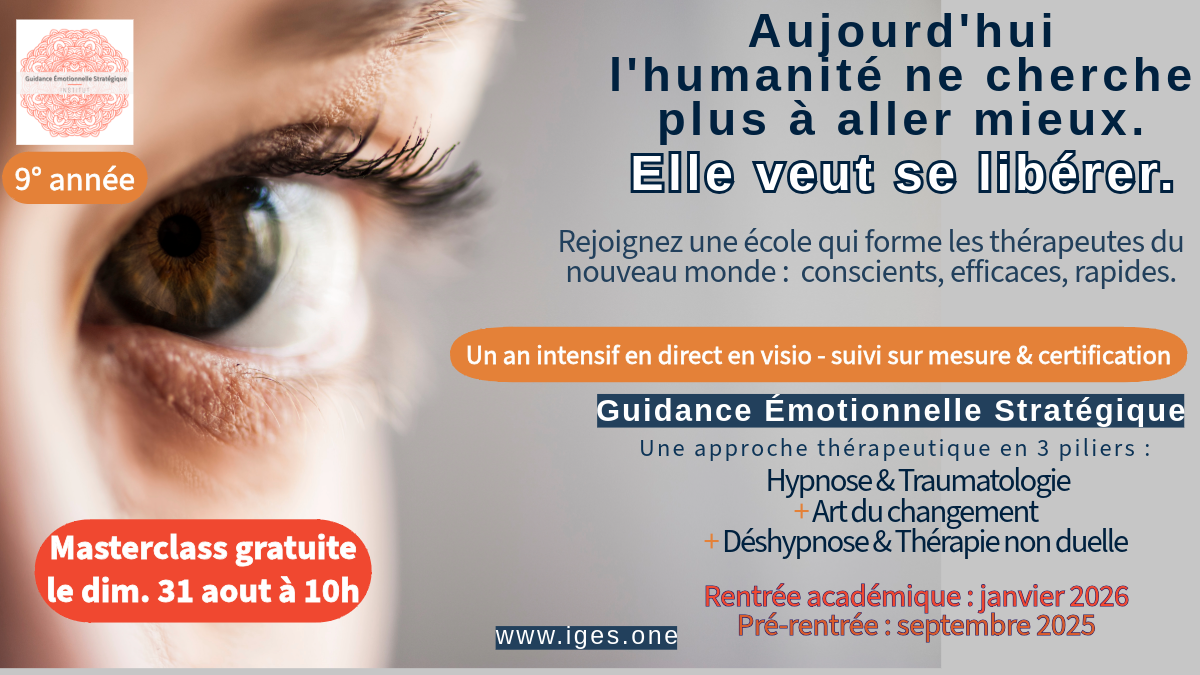 Cette Masterclass ouverte à tous, futurs thérapeutes ou explorateurs, est 100% gratuite et contient plusieurs démonstrations pour découvrir la Guidance Émotionnelle Stratégique; une thérapie du futur plus efficace & multi approches :