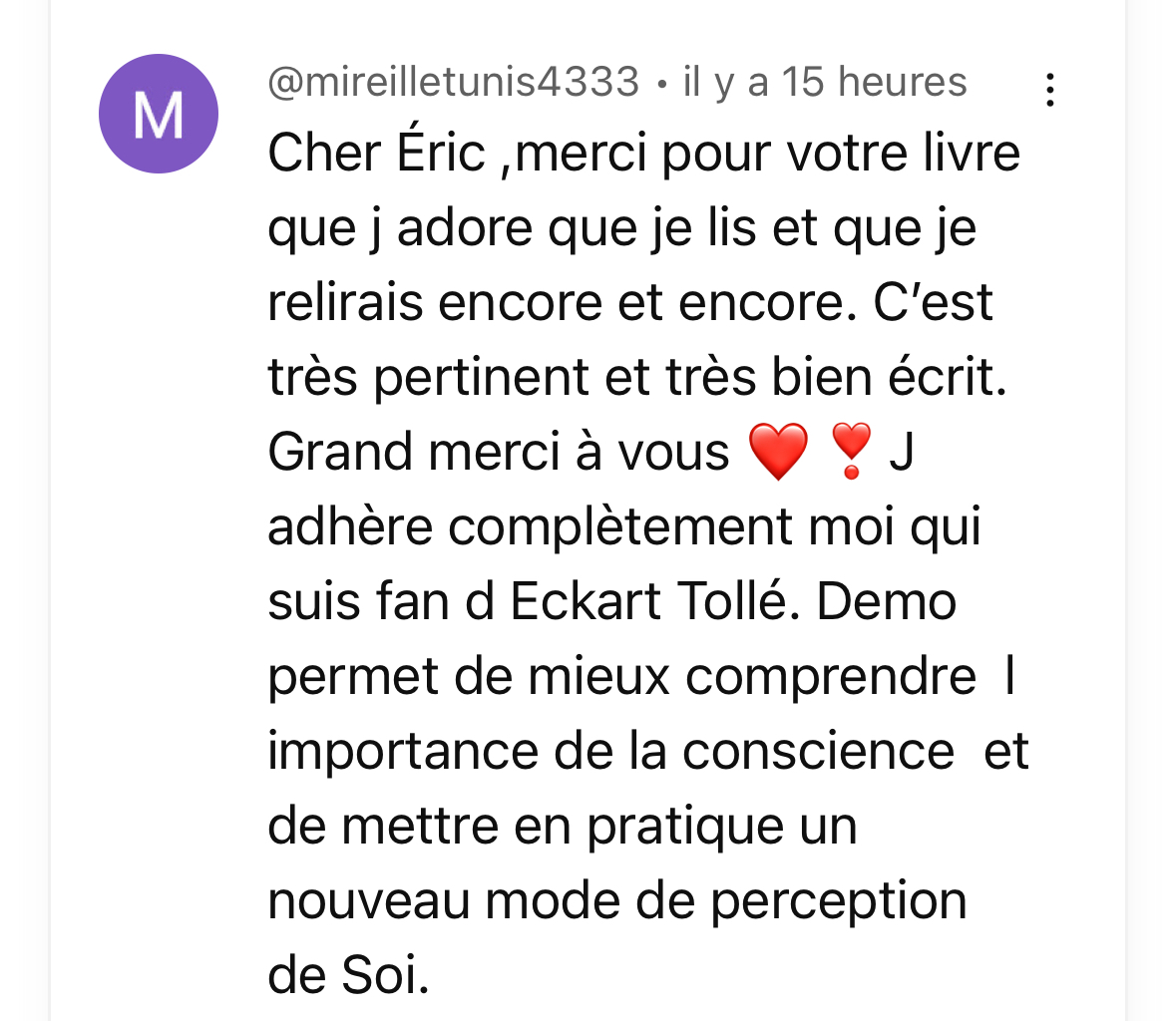Éric, votre livre Démo me fait du bien à un point que je n'avais pas réalisé jusqu'à à ce matin. Votre livre est réalisé de manière géniale ! Je l ai adoré dès le premier instant mais je n avais pas réalisé à quel point les exemples de séances que vous avez ajouté à chaque Démo sont d'une importance et d une aide très profonde. Merci beaucoup pour ce livre qui est pour un guide et une référence ❤️❤️❤️🙏🙏🙏