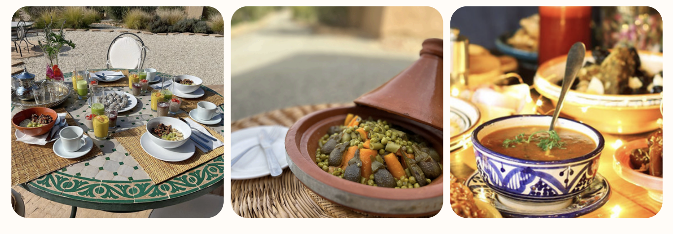 Diner : Salade marocaine, tajine de poulet (recette différente du déjeuner), fruits de saison, eau, thé, café, tisanes du jardin