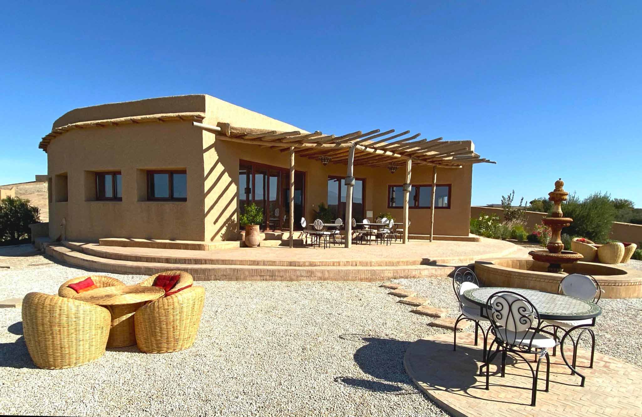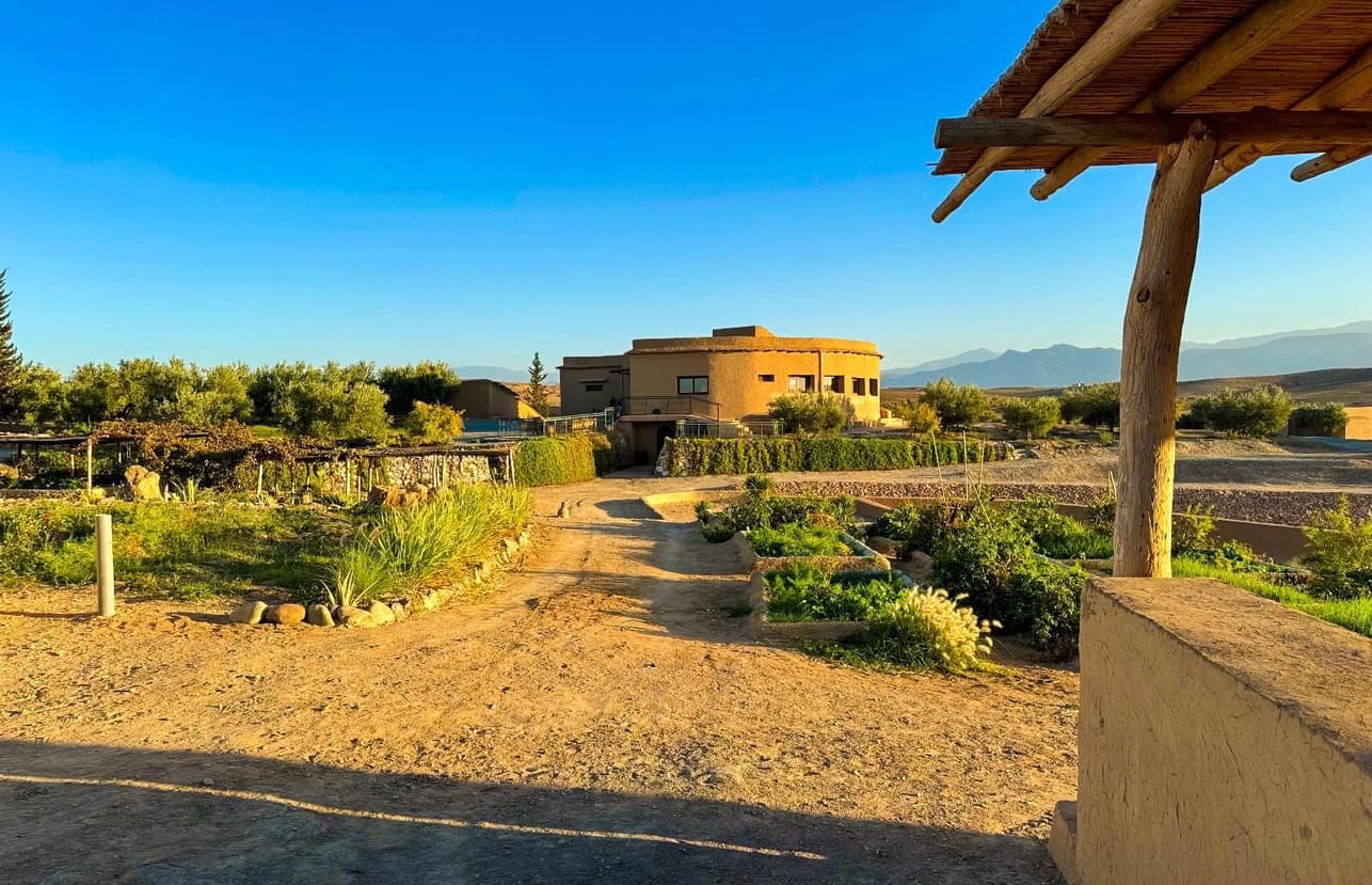 Un cadre idéal pour se ressourcer : une oasis de verdure au milieu d’une zone semi-désertique, avec une vue panoramique sur le sommet de l’Atlas.