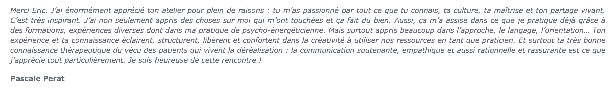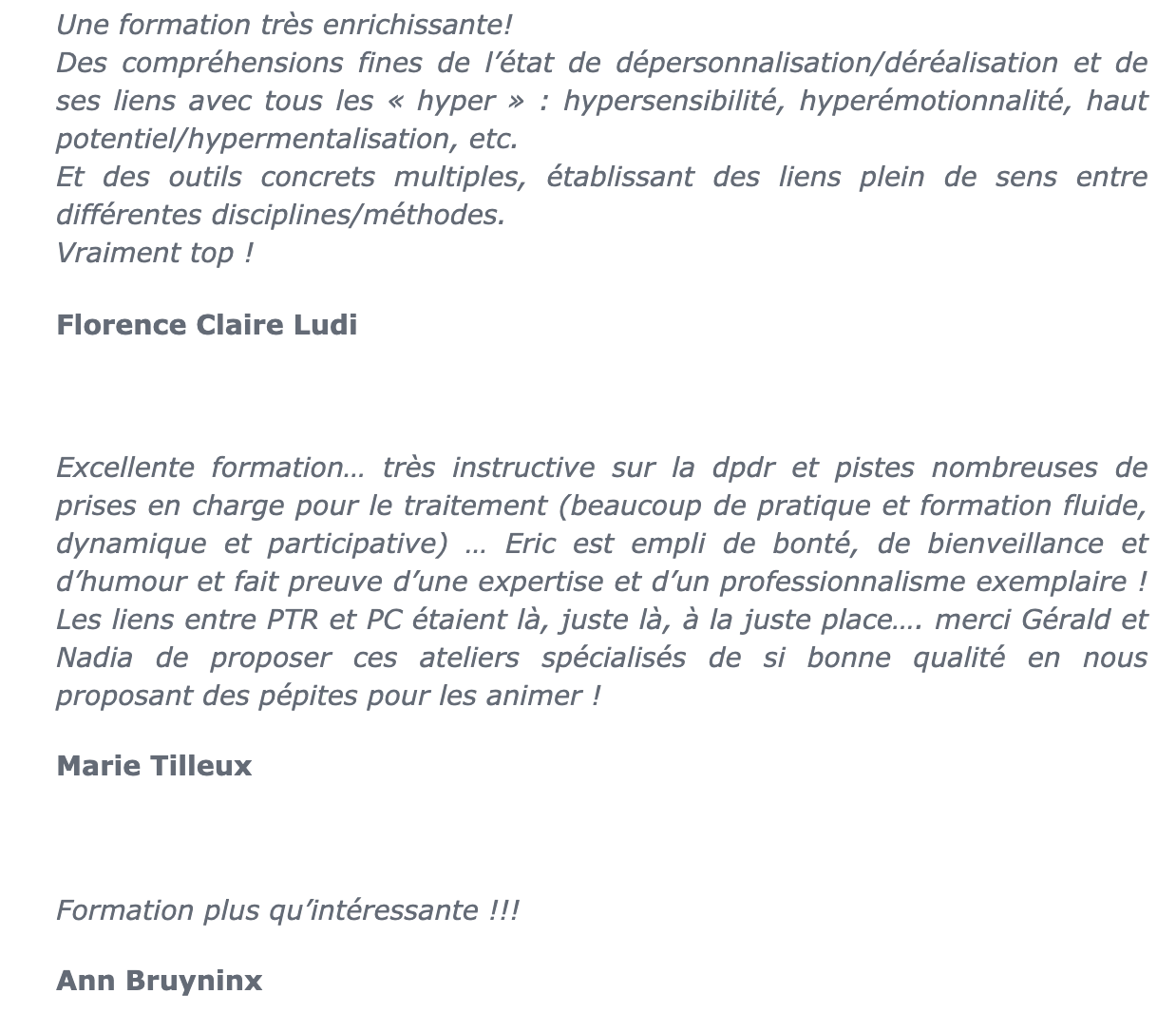 Mon expérience thérapeutique de 30 ans m’a permis de libérer plusieurs dizaines de patients à ce jour de ces symptômes, certains même étant déréalisés et/ou dépersonnalisés depuis plus de 20 ans et parfois plus.