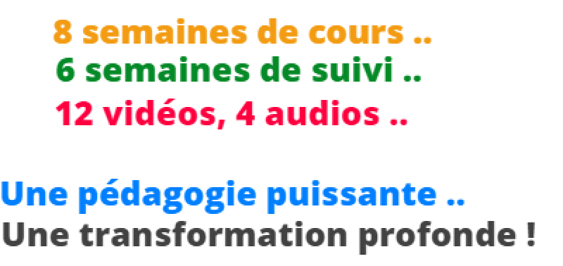 Une garantie de qualité en béton Vous recevez une garantie de qualité et de rigueur méthodologique grâce à mes 17 ans d’expérience dans la formation pour adultes et mes diplômes en psychologie et sciences du changement (NLP, Hypnose, Thérapie brève, ..) .